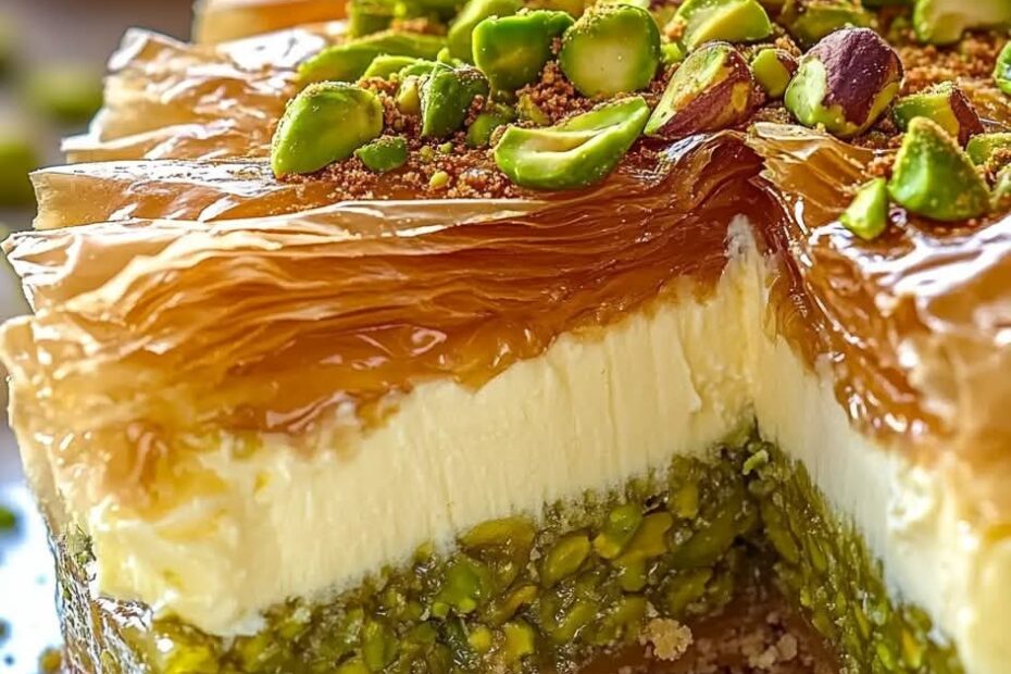 Honig-Pistazien-Baklava-Käsekuchen mit knusprigen, goldbraunen Filoteigschichten