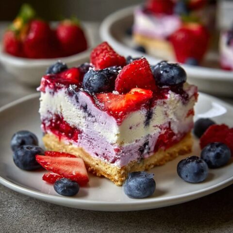 Die Beerenmischung gleichmäßig auf der Käsekuchenschicht verteilen.
