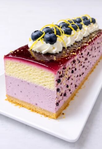 Blaubeer-Mousse-Schnitte mit Biskuit und Fruchtspiegel