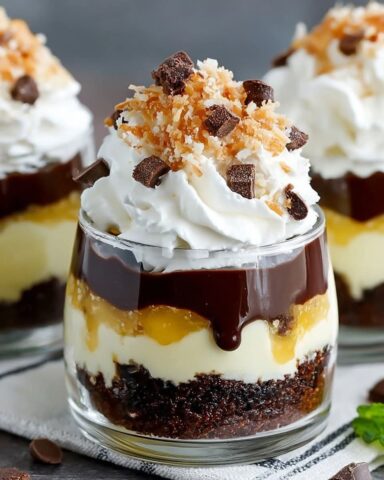 In einer separaten Schüssel den weichen Frischkäse, Zucker und Vanilleextrakt glatt und cremig rühren. 3. Schichten Sie die Zutaten in Serviergläsern, beginnend mit einem Löffel Brownie-Krümeln, gefolgt von einer Schicht Frischkäsemischung, dann Schlagsahne, Schokoladenstückchen und Beeren.