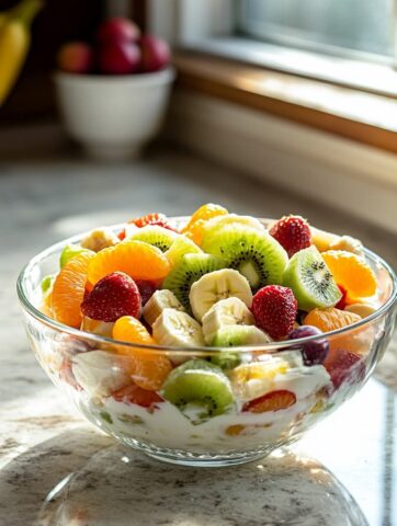 Obst unterheben, kühl stellen und vor dem Servieren nochmal umrühren.