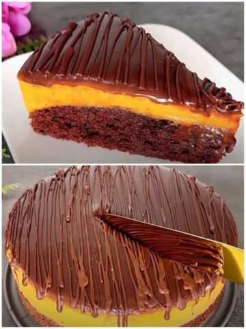 • Die Schokoladenglasur über den Kuchen gießen und mindestens 1 Stunde lang kühl stellen.