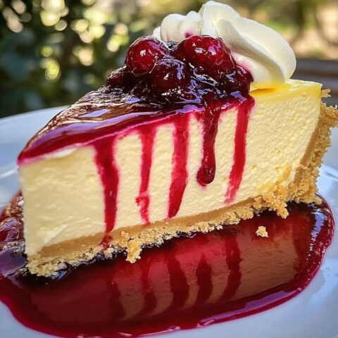 Ein cremiger Käsekuchen mit fruchtiger Erdbeersauce