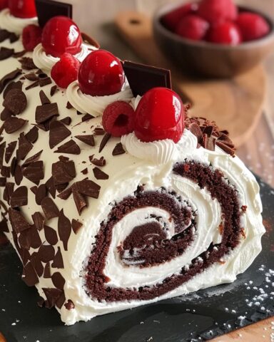 Den abgekühlten Kuchen ausrollen und eine gleichmäßige Schicht Schlagsahne darauf verteilen. Mit gehackter Zartbitterschokolade, Kirschen und Himbeeren bestreuen.