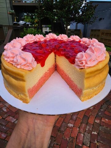 Frischkäse, Quark, Zucker, Eier, Vanille, Stärke und Schlagsahne glatt rühren. Auf die Erdbeer-Schicht gießen.