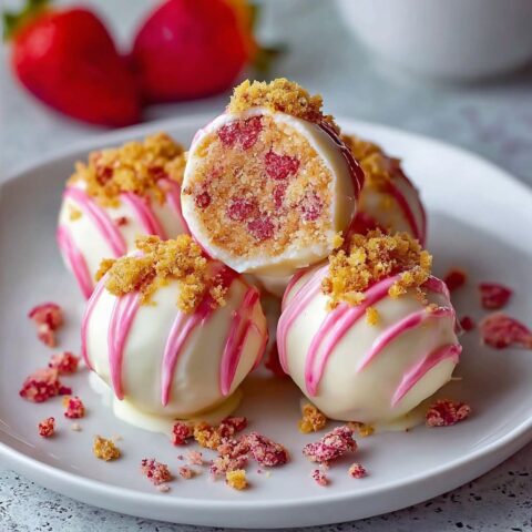 Zurück auf das Backpapier legen und nach Belieben mit zerdrückten Erdbeeren garnieren oder beträufeln.