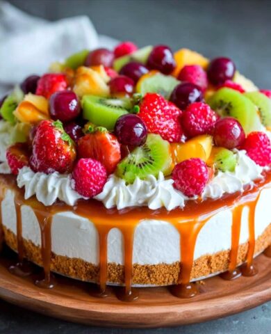 Fruchtiger Käsekuchen ohne Backen mit Karamellüberzug