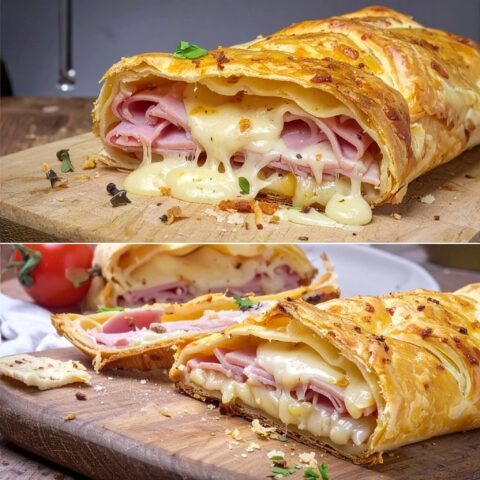 Den Blätterteig ausrollen und die Schinken-Käse-Mischung gleichmäßig darauf verteilen, dabei rundherum einen Rand von ca. 1 cm frei lassen.