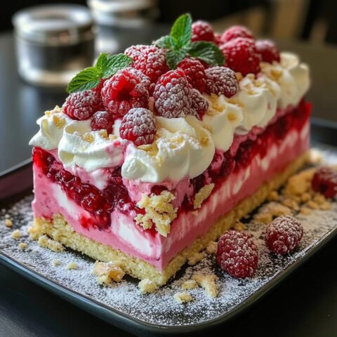 Restliche Schlagsahne steif schlagen und in Tupfen auf den Kuchen spritzen. Mit frischen Himbeeren, Minzblättern und etwas Puderzucker verzieren.
