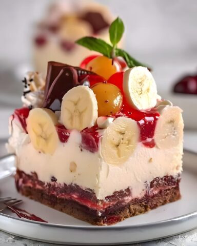 Vor dem Servieren mit Schlagsahne, zusätzlichen Bananenscheiben, Maraschino-Kirschen und Schokoladenstückchen garnieren.