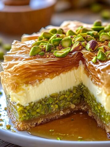 Honig-Pistazien-Baklava-Käsekuchen mit knusprigen, goldbraunen Filoteigschichten