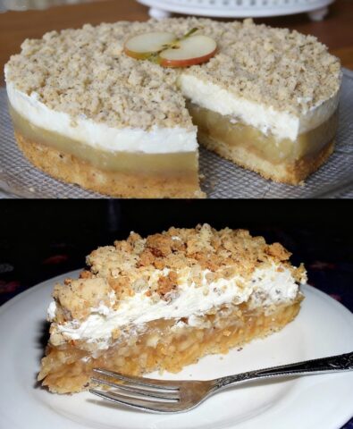 Aus Mehl, Zucker, Nüssen und Butter Streusel formen, über die Füllung streuen und bei 180 °C etwa 40 Minuten backen.