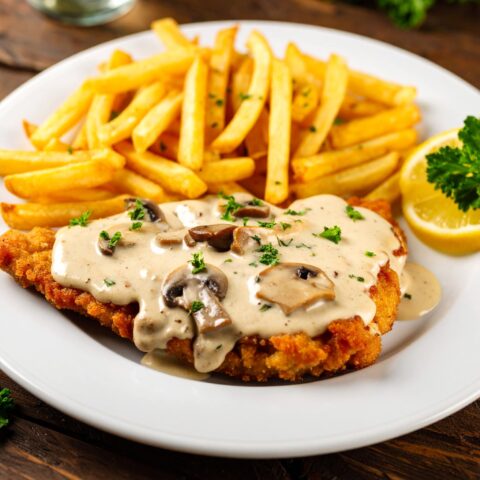 8️⃣ Schnitzel mit Jägersoße, Champignons und heißen Pommes servieren, mit Petersilie bestreuen.