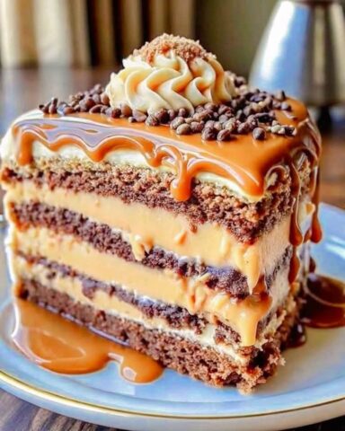 Die Biskuitböden mit der Karamell-Kaffee-Creme füllen und übereinander stapeln.
