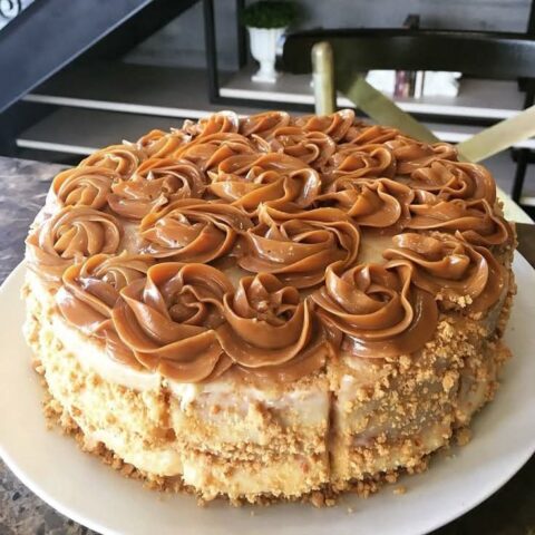 Die Seiten mit zerbröselten Keksen bestreuen und mit Karamellwirbeln verzieren.