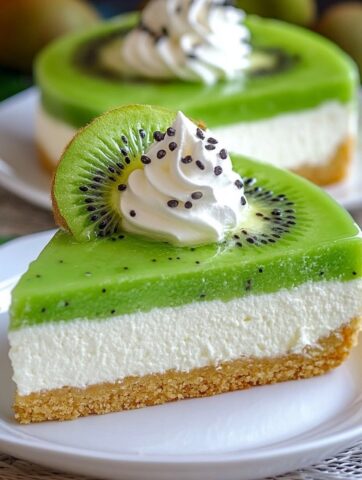 Vor dem Anschneiden nach Belieben mit frischen Kiwi-Scheiben und etwas Schlagsahne dekorieren.