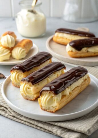 Füllen Sie die Eclairs vorsichtig mit der Vanillecreme aus einem Spritzbeutel mit mittelgroßer, glatter Tülle, sodass sie gerade eben gefüllt sind.
