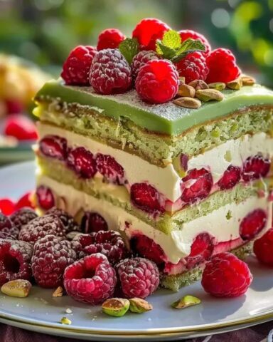 Oberfläche mit einer dünnen Schicht Creme bestreichen, gehackte Pistazien und Himbeeren darauf geben. Mit Puderzucker bestäuben und Minzblättern garnieren.