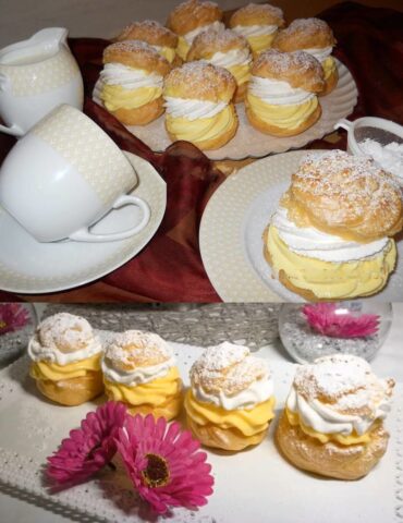Die abgekühlten Donuts halbieren, die Füllung, dann die Sahne in Schlagsahne geben und mit der Oberseite des Donuts abdecken. Mit Puderzucker bestreuen