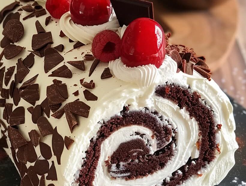 Zutaten: 4 große Eier60 ml Kristallzucker130 ml Mehl60 ml Kakaopulver1 TL Backpulver190 ml Sahne 60 ml Puderzucker120 ml dunkle Schokolade, gehackt120 ml frische Kirschen, entsteint60 ml Himbeeren 1 TL VanilleextraktSchokoladenraspeln zum GarnierenFrische Kirschen und Himbeeren… Elegante Schwarzwälder Kirschrolle