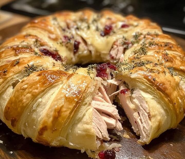 Zutaten: 2 Dosen (je 225 g) gekühlter Croissantteig 2 Tassen gekochtes, zerkleinertes Truthahnfleisch 1/2 Tasse Cranberrysauce 1 Tasse geriebener Cheddar 115 g Frischkäse, weich 1/4 Tasse gehackte Frühlingszwiebeln 1 TL Knoblauchpulver 1/2 TL getrockneter Thymian… Truthahn-Cranberry-Croissant-Ring