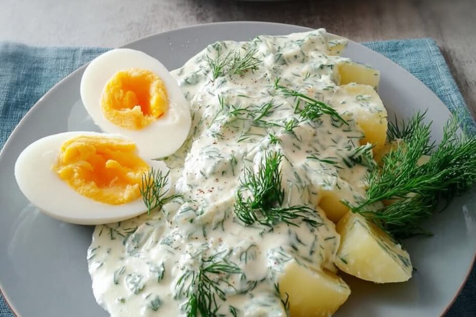 Hausgemachte Eier in Dillsoße mit Butterkartoffeln