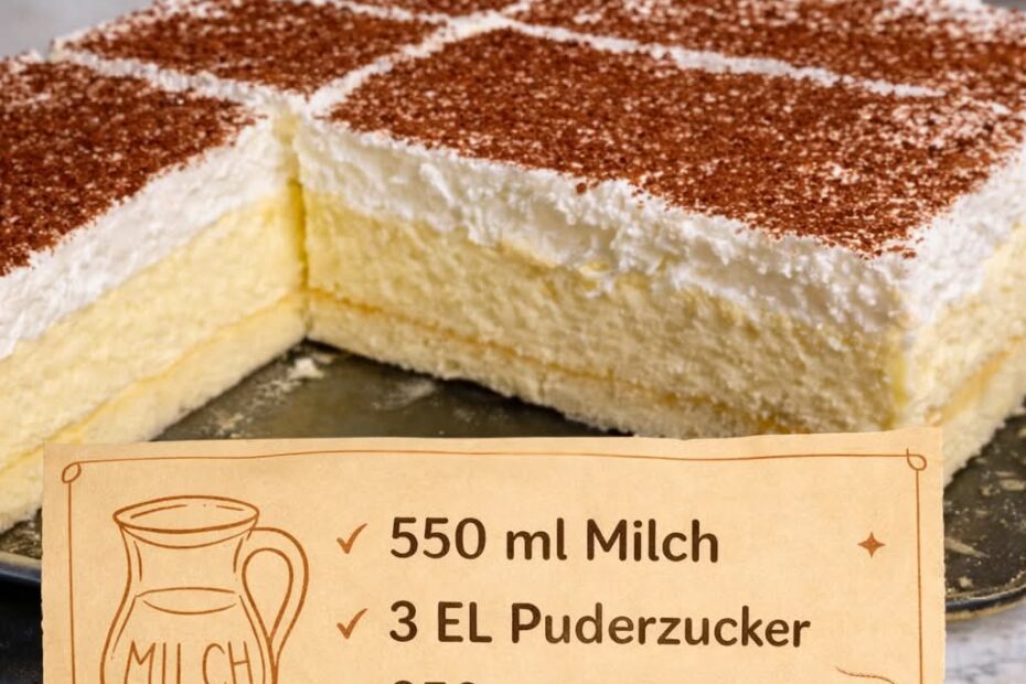 Zubereitungszeit ca. 15 Minuten + Kühlzeit 👥 Portionen 1 rechteckige Form (ca. 20×30 cm) Zutaten 550 ml Milch 1 Päckchen Vanillepuddingpulver 3 EL Puderzucker 250 ml Schlagsahne 200 g Butterkekse oder Löffelbiskuits Kakaopulver oder Zimt… Vanillecreme-Kuchen ohne Backen