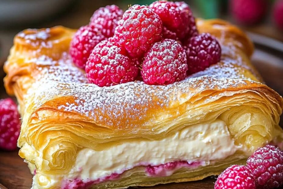 Zutaten: 2 Dosen gekühlter Croissantteig 450 g Frischkäse, weich 200 g Zucker 1 TL Vanilleextrakt 60 g ungesalzene Butter, geschmolzen 60 g Zucker (zum Bestreuen) 1/2 TL gemahlener Zimt (optional) Puderzucker (zum Garnieren) Frische Himbeeren… Käsekuchen-Croissant