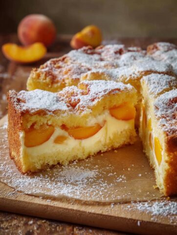 Schichten: Den Teigboden mit warmem Pudding bestreichen, Pfirsichstücke darauf verteilen. Die zweite Teighälfte ausrollen oder grob raspeln und darauf verteilen.