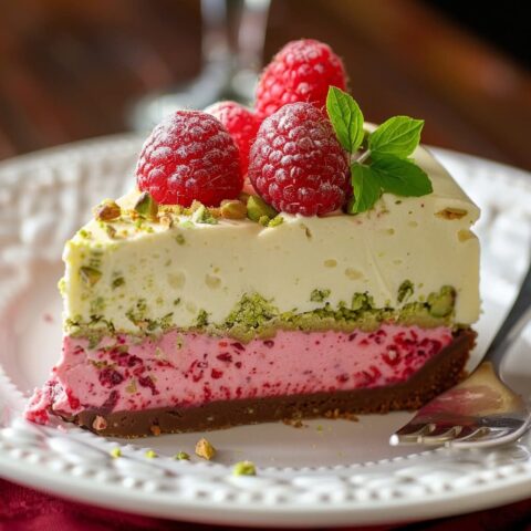 Genießen Sie diesen eleganten Pistazien-Himbeer-Crunch-Käsekuchen mit knusprigem Pistazienboden, cremiger Käsekuchenfüllung und spritziger Himbeersauce. Er wird auf jeder Feier oder jedem besonderen Anlass Eindruck machen!
