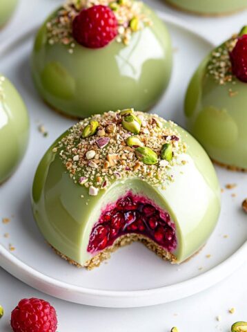 Auf einen Teller geben und mit gehackten Pistazien, einer frischen Himbeere und zartem essbarem Blattgold garnieren.