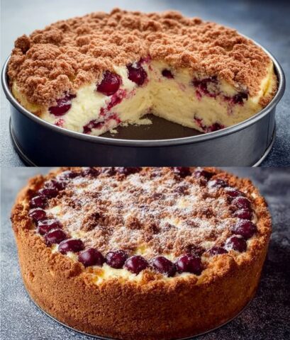 Jetzt das Eiweiß steif schlagen. Eischnee, Kirschen und Hälfte der Schokostreusel unter die Quarkmasse heben. Auf dem Streuselboden verteilen.