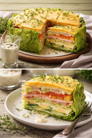 Salattorte auf einer großen Platte schichten oder in einer Form anrichten. Beim Schichten drückst du am besten nicht zu fest, damit die Torte luftig bleibt. Sofort servieren.