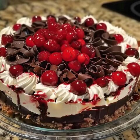 Dieser Schwarzwälder Käsekuchen vereint die reichhaltige, cremige Textur von Käsekuchen mit den fruchtigen und schokoladigen Aromen der Schwarzwälder Kirschtorte und ergibt ein köstliches und optisch ansprechendes Dessert.