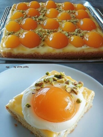 Nach dem Abkühlen die abgetropften Aprikosenhälften als „Eigelbe“ auf die „Eiweiße“ legen und die Pistazien darüber streuen.